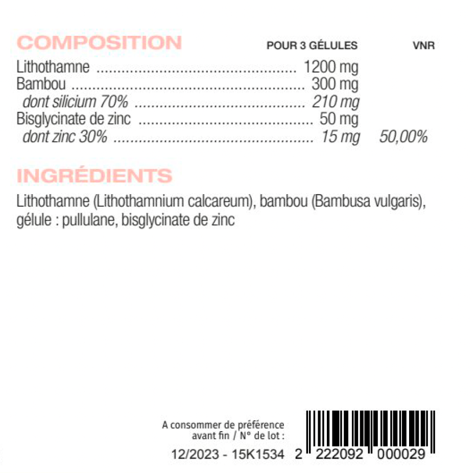 La formule contient de l'algue lithothamne, de l'extrait de bambou et du bisglycinate de zinc.